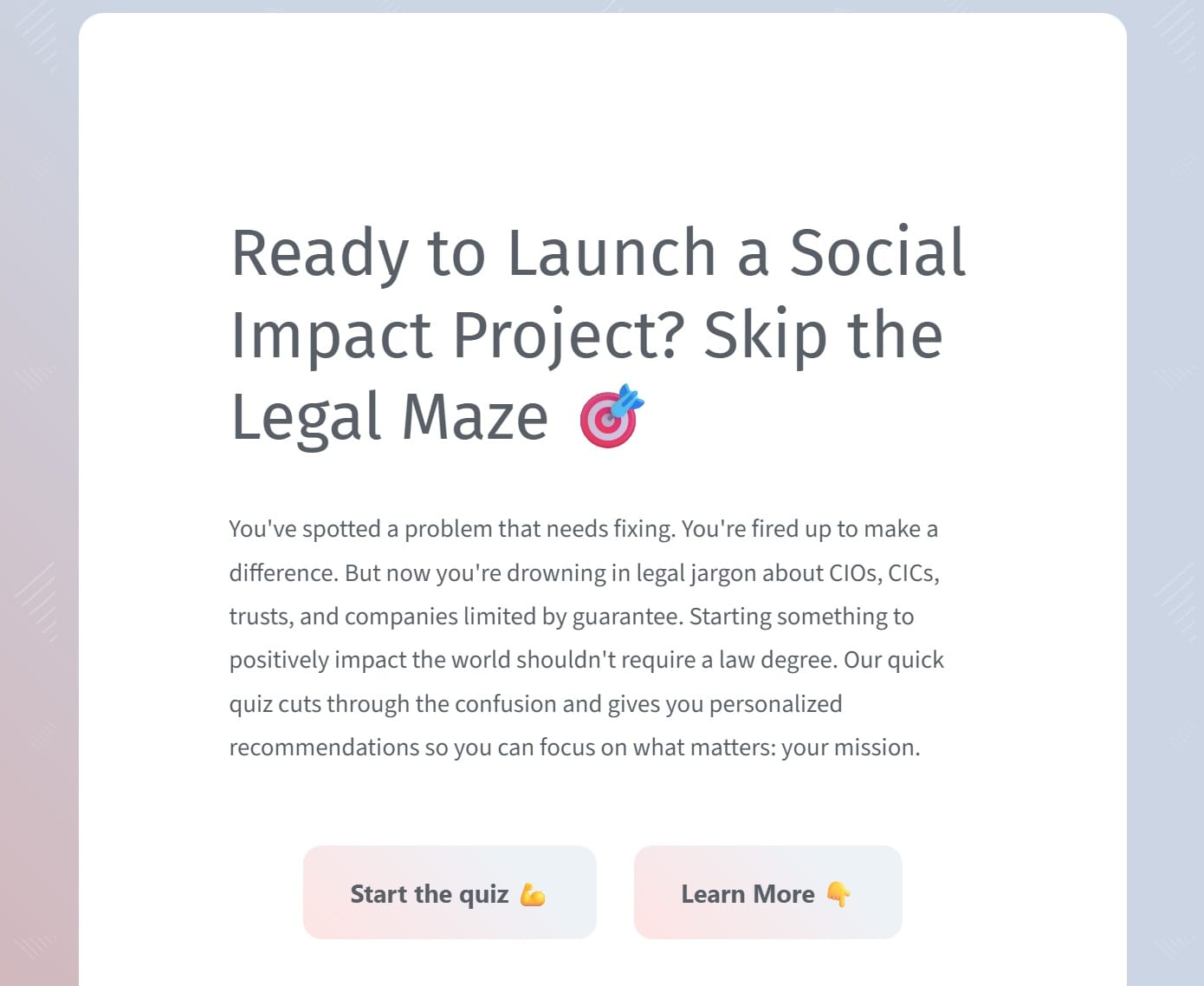 Free UK nonprofit legal structure quiz. Find your ideal charity, CIO, CIC or trust structure. Personalised recommendations in 6 minutes.