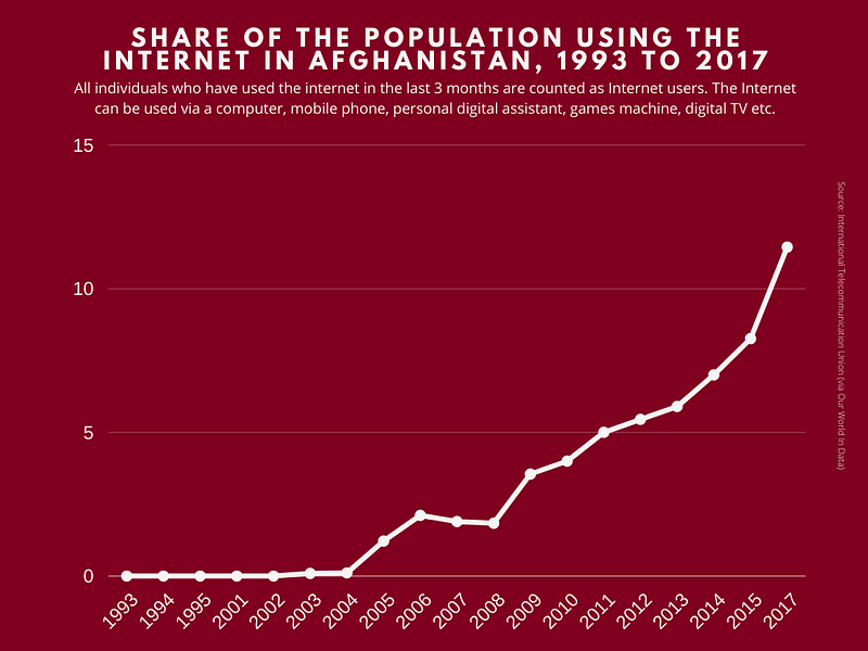 Afghanistan went from nearly universal internet disconnection to over 4 million consistent internet users. Mobile phone usage saw a similar increase — going from near zero to over half the country now having a mobile phone subscription.