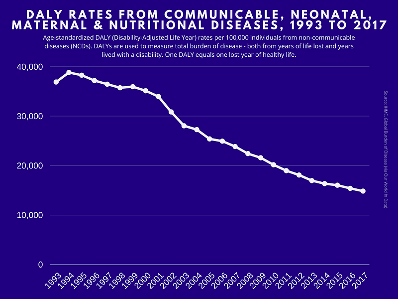 Due to a variety of factors, including better food security and access to drinkable water, people in Afghanistan today die less needlessly than they did in the 1990s. Specifically, we’ve slashed by half the number of DALYs lost in Afghanistan: from almost 40,000 in 1994 to approximately under 15,000 today.