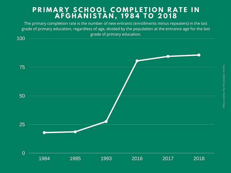 One of the biggest successes in Afghanistan over the past 20 years has been the increase in primary school enrolments and completion rates for both girls and boys. Today, over 85% of children complete primary school, in comparison to 28% under Taliban rule in the late 90s. 67% of girls are completing primary school, which admittedly is less than the percentage of boys but it’s more than 0% under Taliban rule.